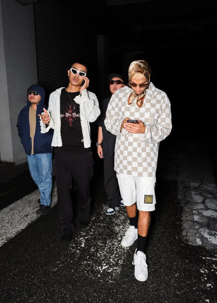 Fariz (second from left) wears acetate sunglasses and polyester mesh boots, Dolce & Gabbana; and his own Youths In Balaclava shirt, T-shirt and accessories, and pants. Raja (far right) wears Damier cotton and polyamide overshirt, cotton cargo shorts and leather sneakers, Louis Vuitton; and his own accessories and socks. Their musician pals YAØ (far left) and Tengy (second from right) wear Giorgio Armani polyamide sunglasses with mirrored lenses, W Optics; and their own clothes, shoes and accessories