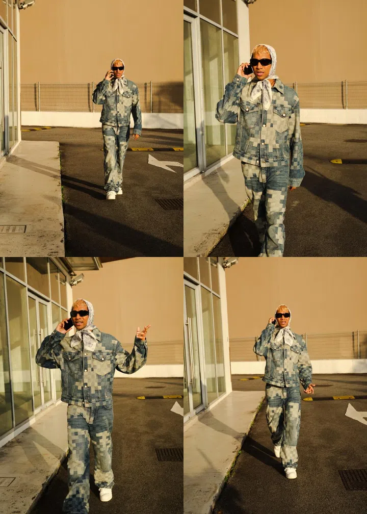 Raja wears Damoflage denim jacket and matching skate pants, and leather sneakers, Louis Vuitton; and his own sunglasses and scarf (worn on head)