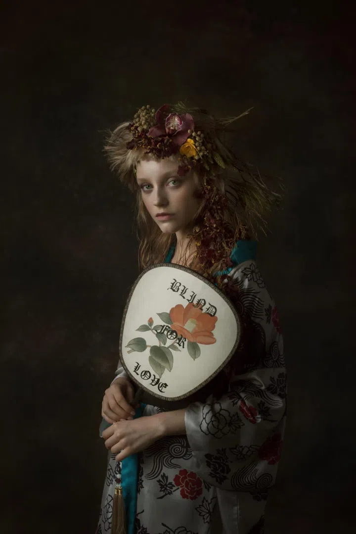 The Orientalist influences at Gucci evoke the sensuous beauty of Rembrandt’s Flora (1634). Embroidered silk kimono, and wood and paper fan, Gucci