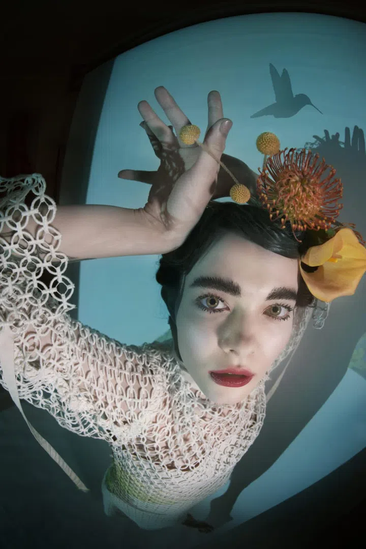 The eclectic references – bats and oversized calla lilies – of J.W. Anderson at Loewe this season parallels the surrealist influences of Frida Kahlo, whose works include Self-portrait With Thorn Necklace And Hummingbird (1940). Cotton midi dress, Loewe