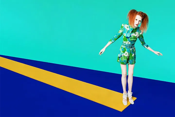Michael Kors Collection’s vibrant hues and prints, coupled with its mid-century modern sensibilities, deserve a spot in David Hockney’s A Bigger Splash (1967). Michael Kors Collection polyester top, matching shorts, and suede belt, Michael Kors. Suede ankle-strap flats, Chanel
