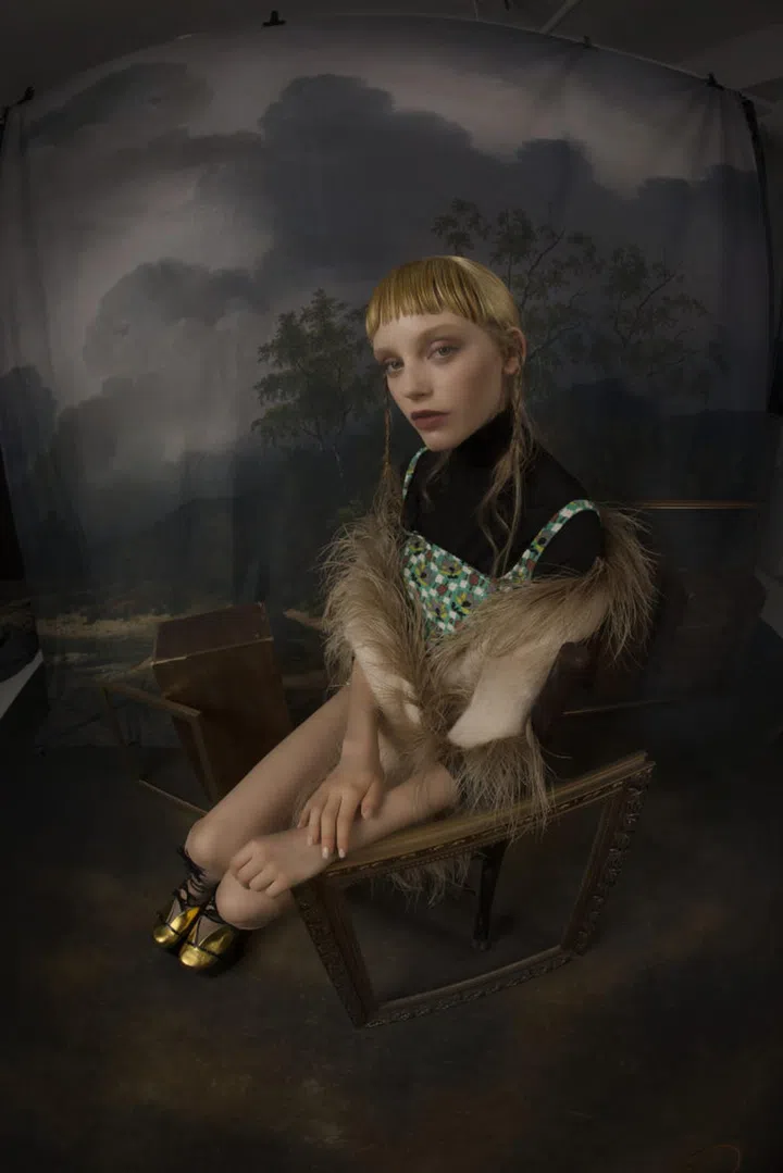 The work of fashion’s Renaissance woman – Miuccia Prada – gets reinterpreted as the raiments of Leonardo da Vinci’s Mona Lisa (circa 1503–06). Tweed cropped top, matching shorts, wool turtleneck, and mink fur stole with ostrich feathers, Prada. Lace socks and leather platform flats, Gucci