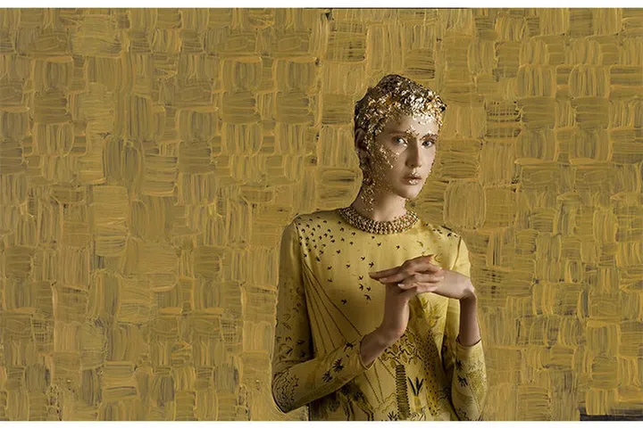 This elegant gilded number from Pierpaolo Piccioli’s solo outing at Valentino is made for a modern-day version of Portrait of Adele Bloch-Bauer I (1907) by Gustav Klimt. Silk drop-waist dress, Valentino. Cactus de Cartier 18K yellow gold necklace with emeralds and diamonds, and matching drop earrings, Cartier