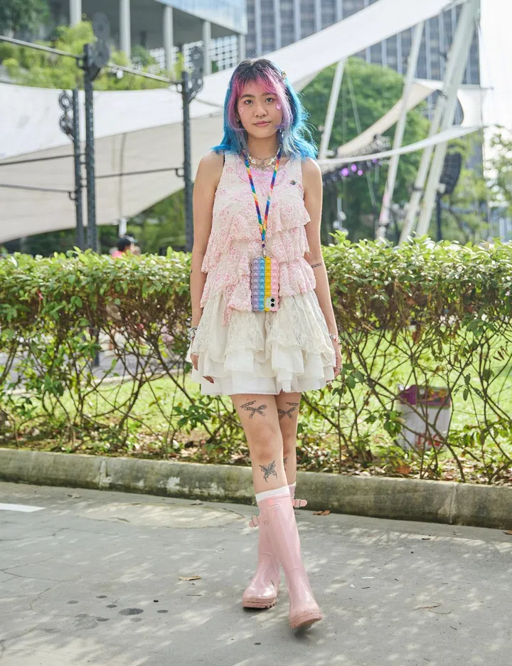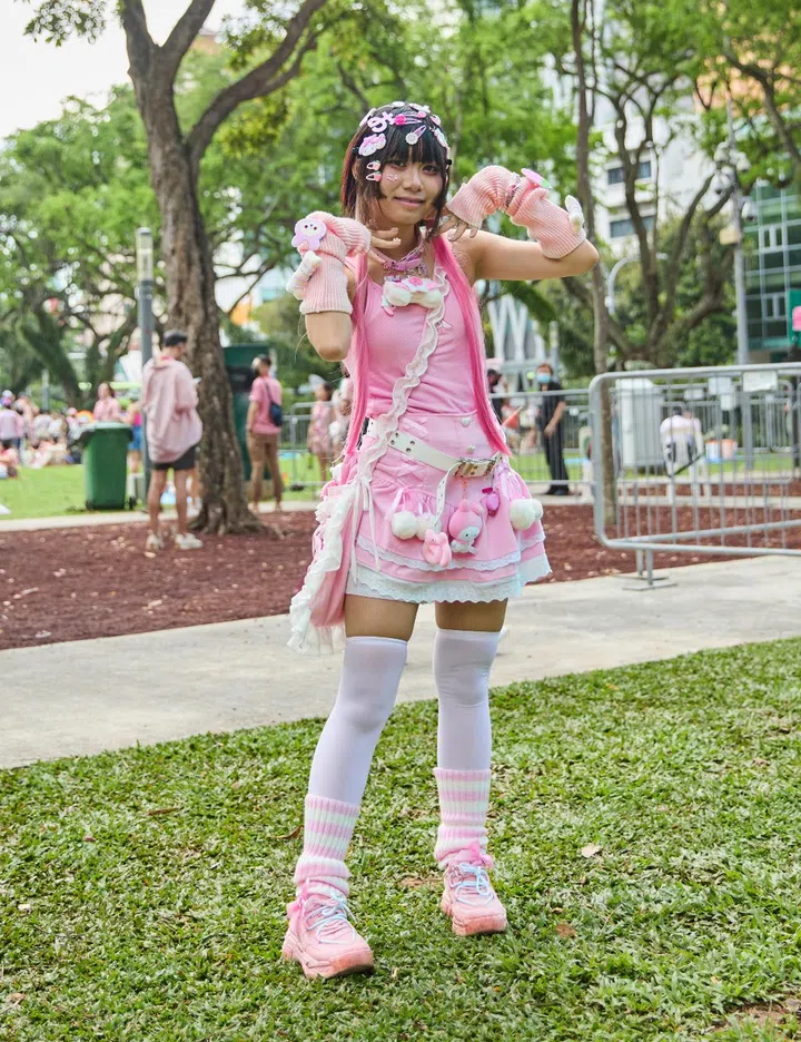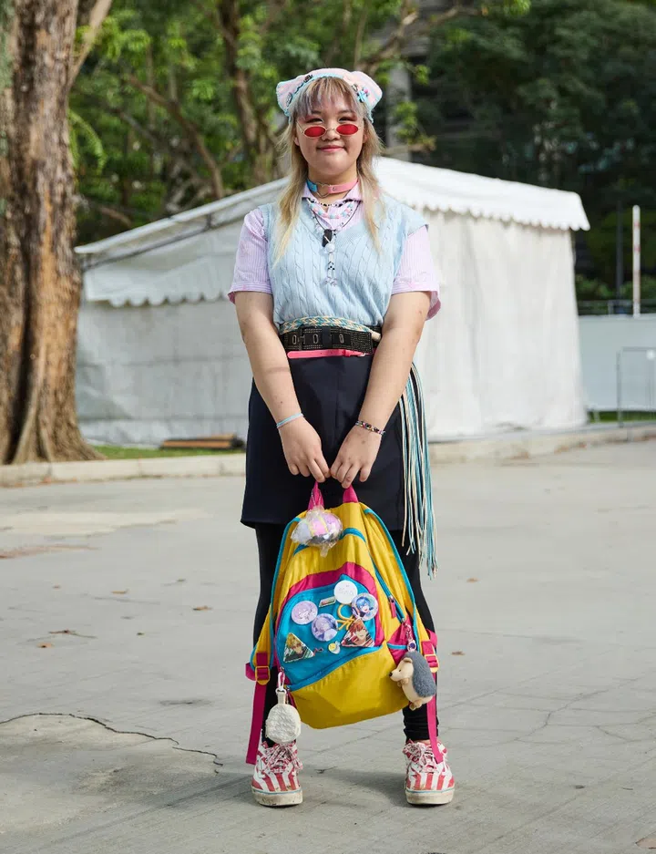 Her fit:“My top, skirt, and bag are from Taobao. I thrifted and decorated my shoes myself. My hair clips are from Taobao, Sanrio, and stores in Japan. My bracelet is from @riesbeads on Instagram, and my belt charm is from @jannyjamberry on Instagram. Other accessories, like hair clips and charms, are from gachapon machines. I'm also wearing nails from @lamos.sg on Instagram.”