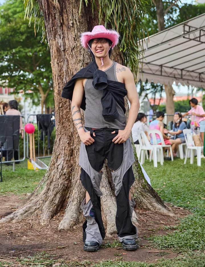 The inspiration behind his outfit: "Truthfully, I prefer simple colours like black, white, and grey, and I usually opt for comfy clothes like a T-shirt, hoodie, and joggers combo. But for this outing, I wanted to dress more uniquely, so I pulled out some favourite high-fashion pieces. Given Singapore's heat, I swapped my joggers for trousers with an interesting cut that revealed some skin and showcased my socks—I love showing off cute or interesting socks, and my chunky Mary Janes were perfect for that 'holes in my trousers' look. I draped my hoodie across my torso to reveal my tattoos and added a vest, a nod to my London days where it's cooler. I always like to have one standout piece, and for Pink Dot, I chose a pink cowboy hat."