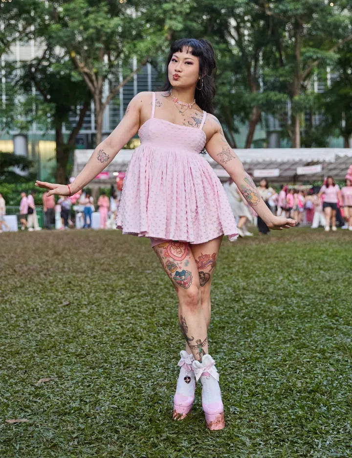 The inspiration behind her outfit: "I didn't base this outfit on anything specific; I just knew I needed something pink for Pink Dot. When I chose this dress (from my mother's wardrobe, naturally), I noticed its grungy details, which inspired me to pair it with other edgy pieces."