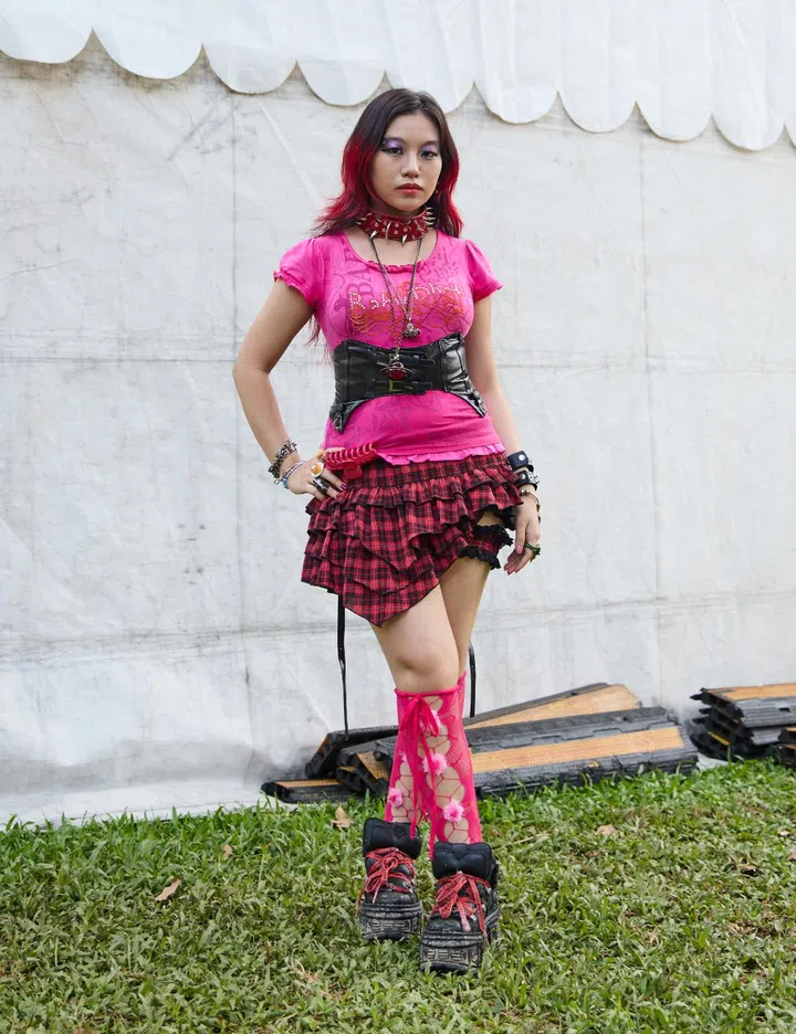 Her fit: “My pink top is from Two Worlds at Golden Landmark. My corset is from a friend, and my skirt is by Red Queen's Black Legion, bought from @yardsaletf on Instagram. I'm wearing stockings from Let Me See on Taobao, and shoes from New Rocks. My choker is from Taobao, and my food-themed rings are from Bandai gashapon machines. My other ring is from Time Will Tell on Taobao. My bracelets are from Taobao, Katong Flea Market, and a souvenir from China, and my necklace is a Vivienne Westwood knockoff from Taobao. My earrings are also from Taobao.”