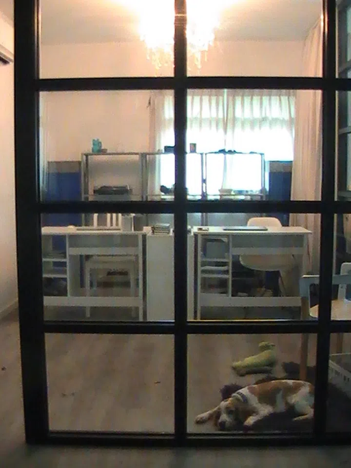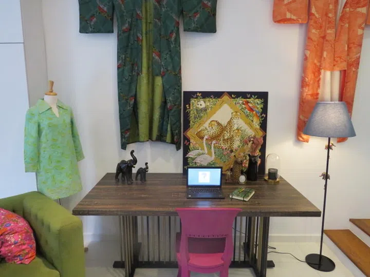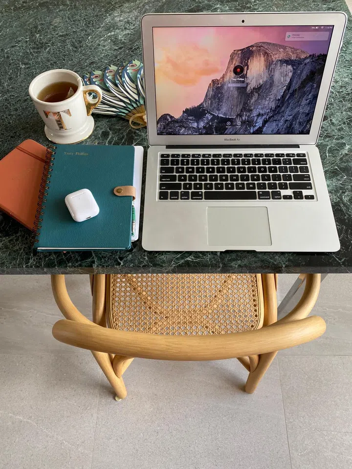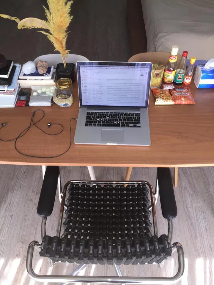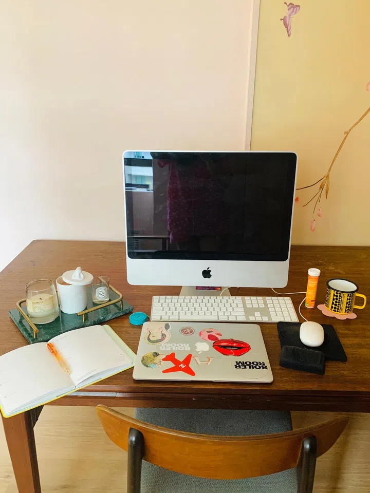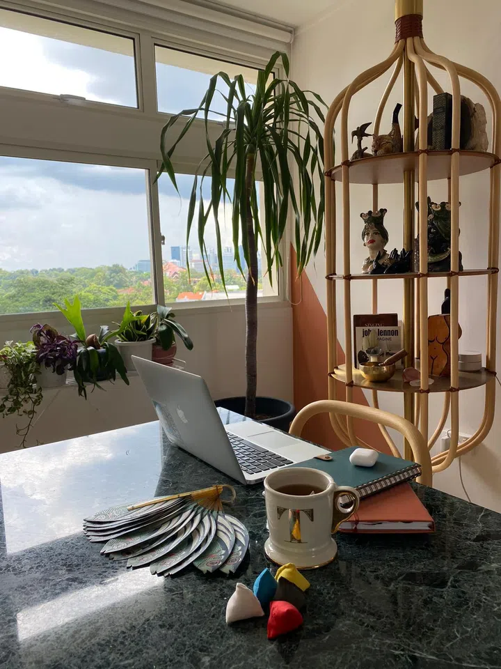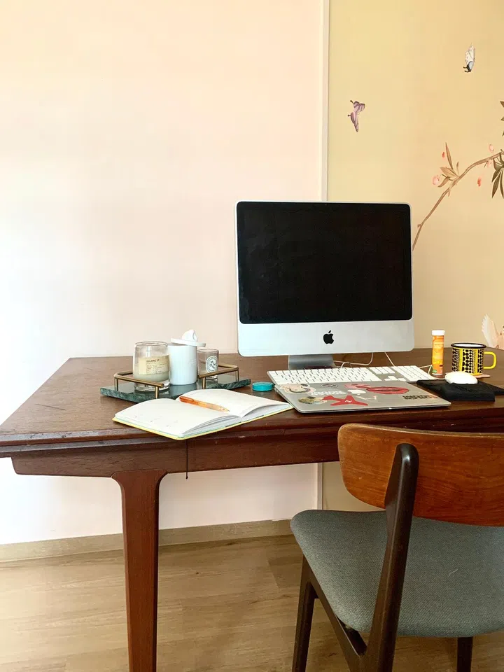 "My desk was actually put together last minute specially for the circuit-breaker. I converted my husband’s vintage Danish dining table and chair into my work station."