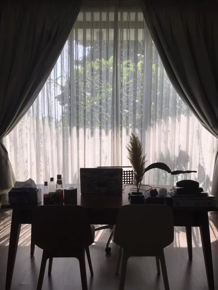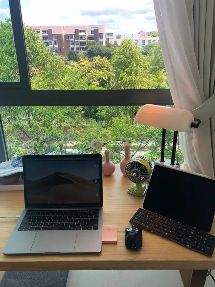 "My work from home situation is basically working from my dining table. I'm always grateful for the gorgeous daylight and the view of trees that has me daydreaming of Miyazaki animations in between zoom calls."