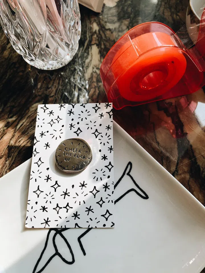 "Another thing you can find on my desk – this pin by @adamjk reminds me that I shouldn’t overthink the things I cannot control and that I should just Cheer The F&$?! Up!"