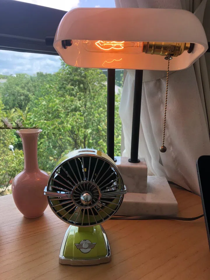 "Of course my trustee little Art Deco desk fan helps keep me cool without having to turn on the aircon."