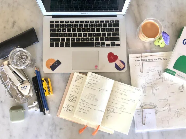 "With two kids under the age of four, this organised desk space signifies a good day for me. Most days, I just work off the living room floor, the couch or even while standing. Since I'm so busy, I personally like writing and sketching down my thoughts as they come so that I can revisit them when I have the time. This is why I have stashes of pencils in different areas – it’s easy to quickly scribble in my notebooks or on drapes of paper no matter where in the house I happen to be."
