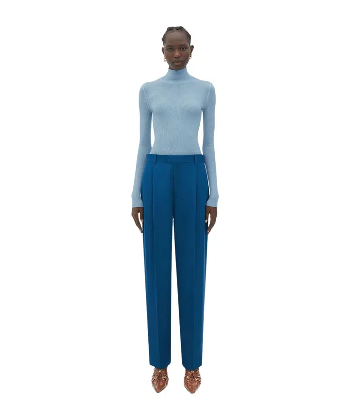 Matthieu Blazy’s Bottega Veneta appears to have effortlessly mastered the art of elegant womenswear tailoring this S/S '24, with these refined wide-leg pants in pacific blue serving as a prime example.