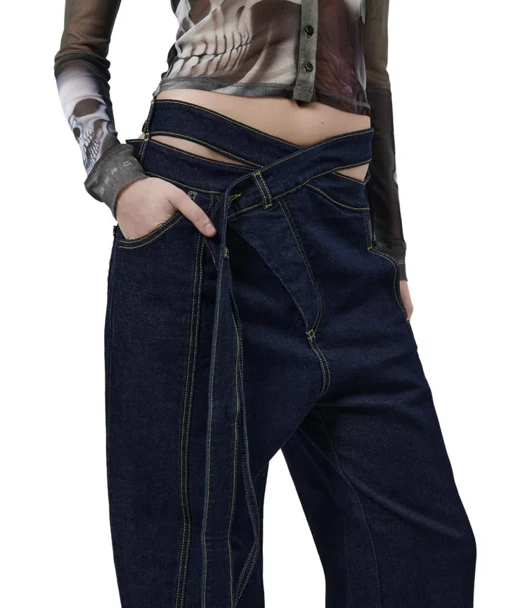 While denim jeans have proven themselves to be a timeless wardrobe staple, switch it up with these wide-cut twisted jeans by Ottolinger, featuring hip cutouts, an exaggerated denim belt, and plenty of pockets for your knick-knacks.