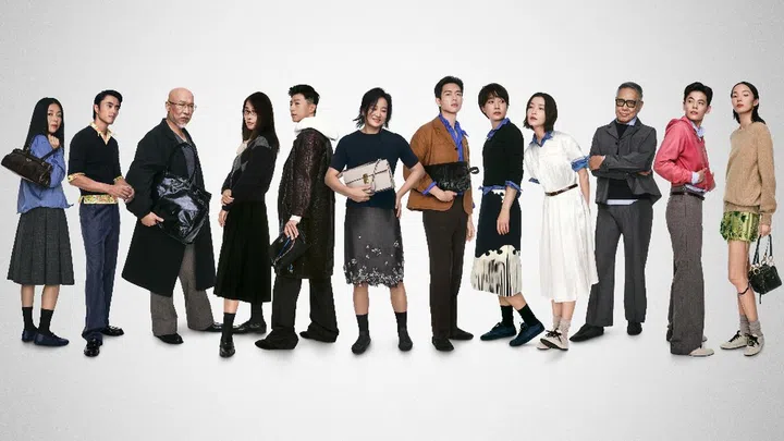 The Prada CNY visuals feature a snake-like chain of famous faces, including brand ambassadors Jia Ling and Li Xian, Ma Long, art historian Wu Hung, artists Peng Wei and Zhang Enli, architect Rossana Hu, and model Du Juan.
