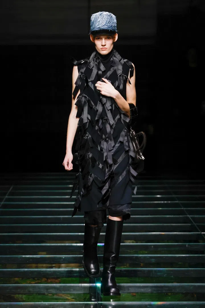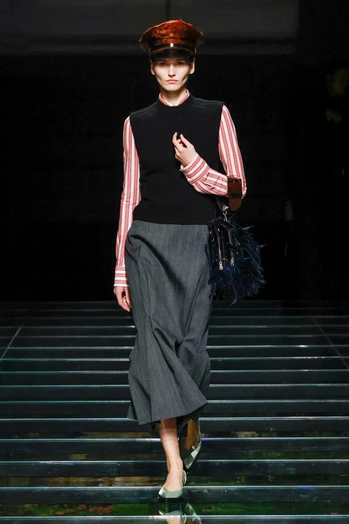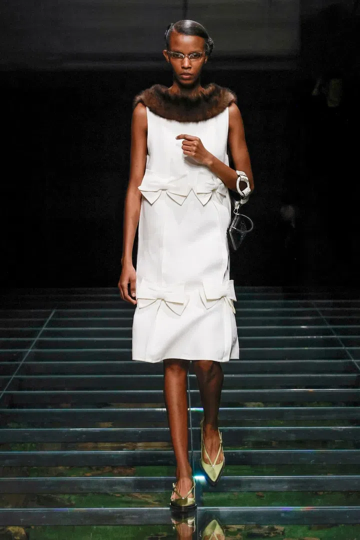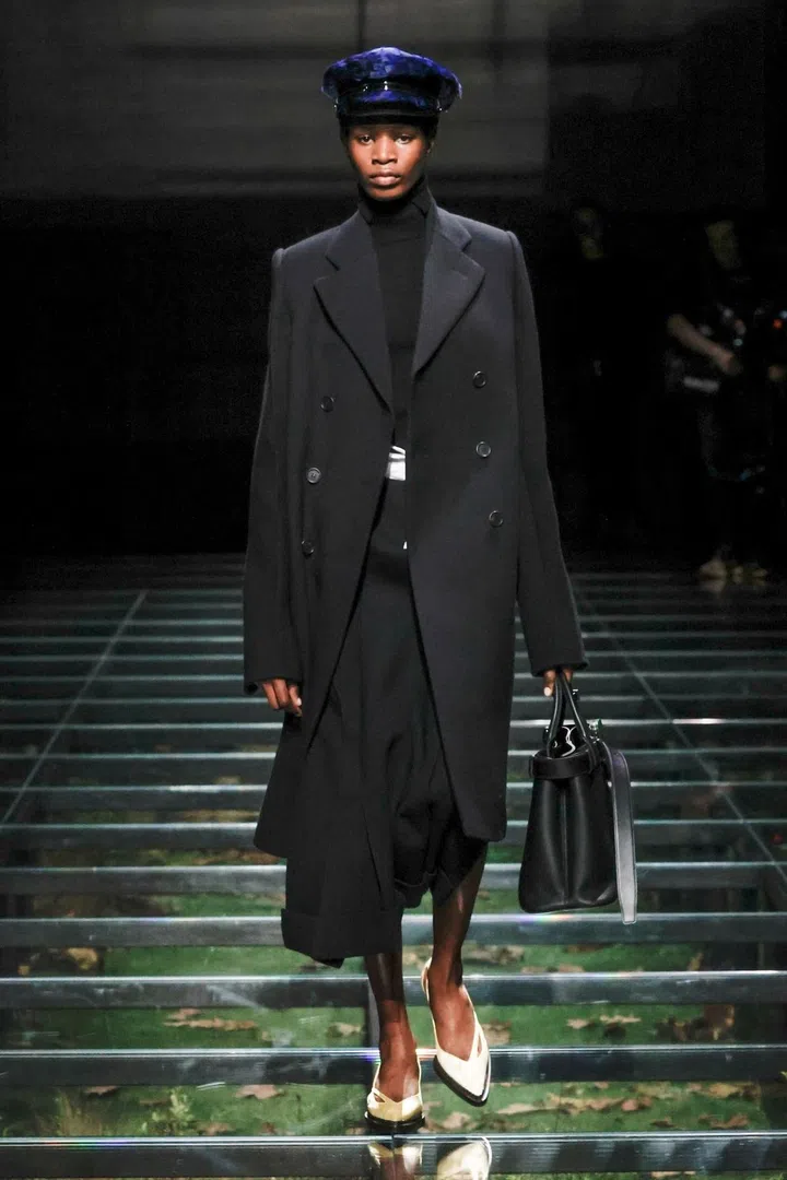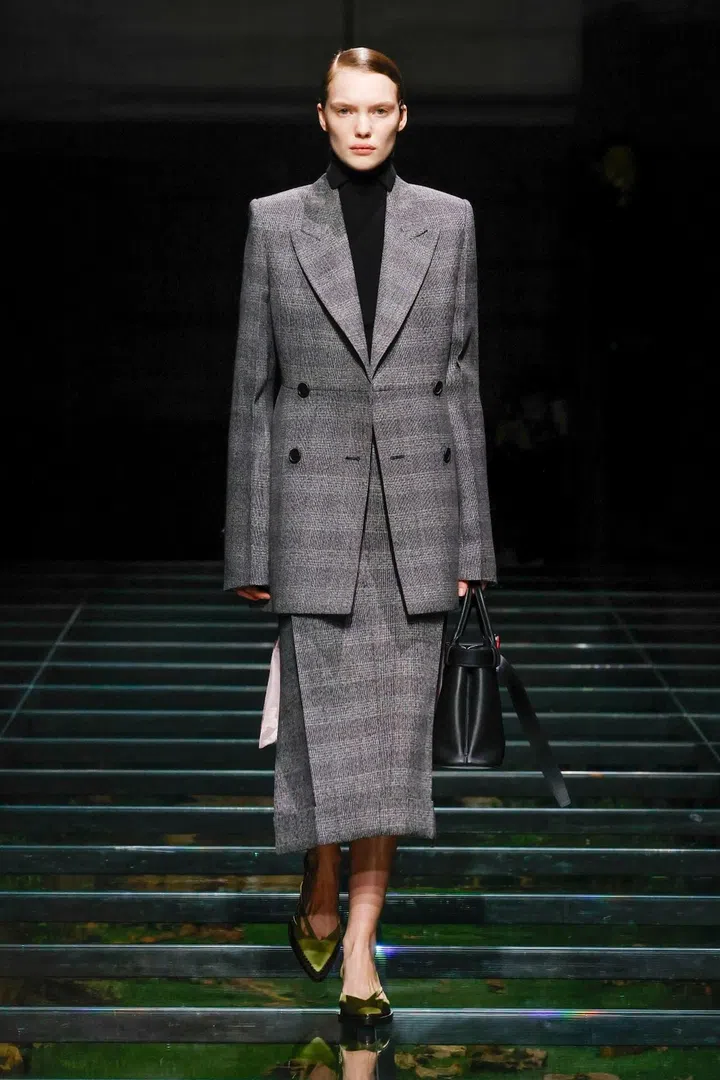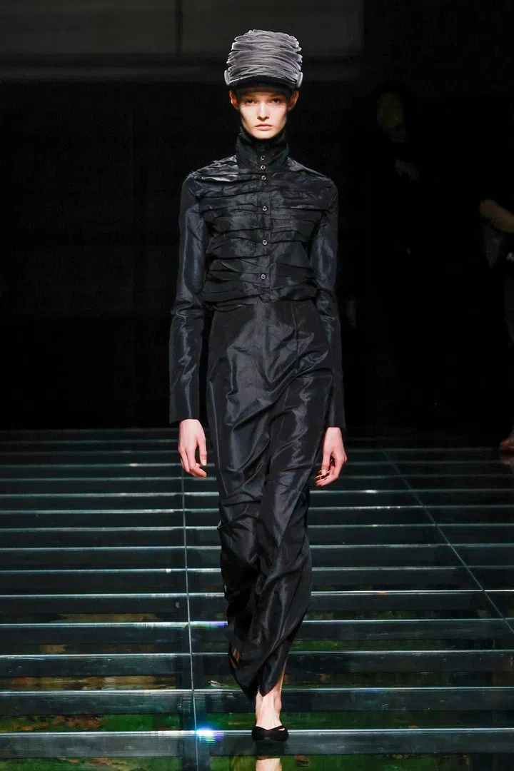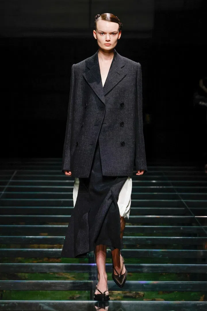 The takeaway: The current state of the world has had a profound impact on Mrs. Prada and Raf Simons, as was evident in their latest collection. Their inspiration included the 2023 Jonathan Glazer film The Zone of Interest, which explored the disturbing reality of building a dream life near the Auschwitz concentration camp. This introspective mood led to their darkest collection since their 2020 collaboration, offering a stark counterpoint to traditional notions of dressing up in those turbulent times. In that dystopian context, the duo proposed clothing as armour, showcased through severe tailoring and prim silhouettes. However, the signature Prada twist remained intact. Silk bustles exploded from the back of dresses, skirts erupted in playful bows, and military-inspired officer hats adorned with feathers added a striking, unexpected finish.
