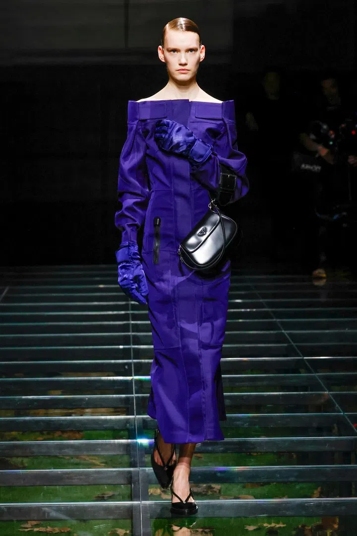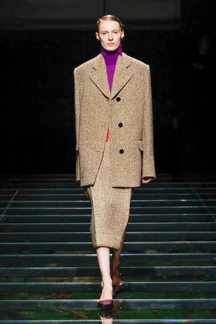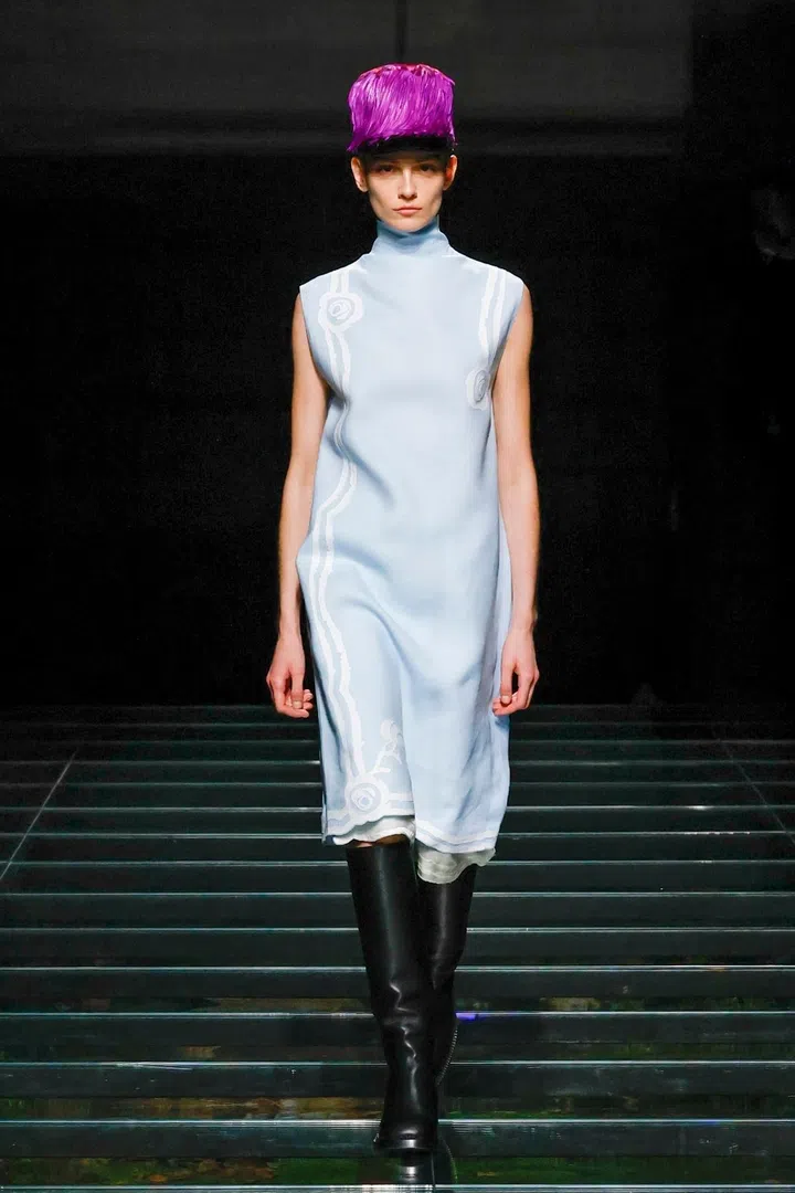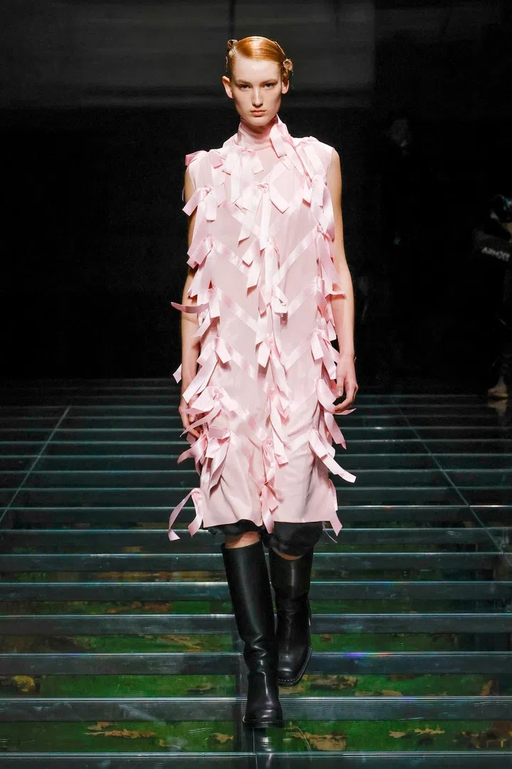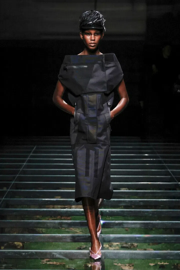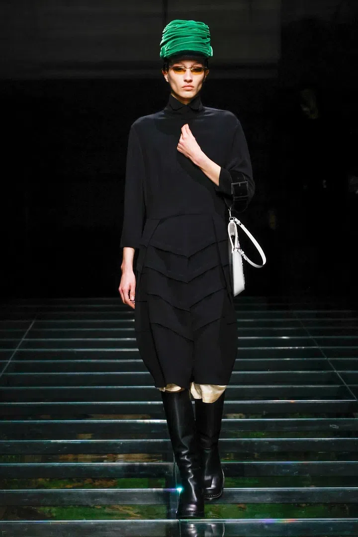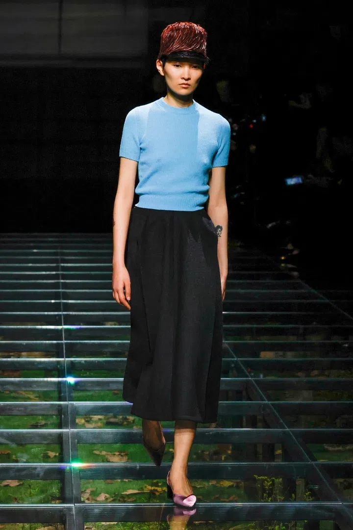 The takeaway: The current state of the world has had a profound impact on Mrs. Prada and Raf Simons, as was evident in their latest collection. Their inspiration included the 2023 Jonathan Glazer film The Zone of Interest, which explored the disturbing reality of building a dream life near the Auschwitz concentration camp. This introspective mood led to their darkest collection since their 2020 collaboration, offering a stark counterpoint to traditional notions of dressing up in those turbulent times. In that dystopian context, the duo proposed clothing as armour, showcased through severe tailoring and prim silhouettes. However, the signature Prada twist remained intact. Silk bustles exploded from the back of dresses, skirts erupted in playful bows, and military-inspired officer hats adorned with feathers added a striking, unexpected finish.