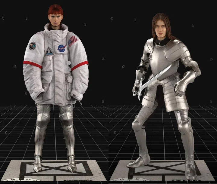 Naturally, the avatars are dressed suitably Demna-style, which means armoured boots (available for sale in limited quantities); futuristic oversized coats with retro Nasa logos; and multi-functional garments one might find handy in the wilderness. Think a blanket that becomes a hooded cape, and a parka that can double as a duffel bag.