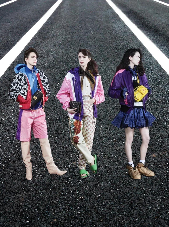 With key themes including the very Ghesquiere-ian term “tech romanticism” and “energetic sportswear”, this concise collection offers a bold proposition to comfort dressing. Expect roomy bermudas, anoraks and track pants, and long-sleeved logo tees in colour blocking so striking, they’d be hard to miss: bright blue with bordeaux; candy pink with purple; lemon yellow with lime green. The romance comes through in broderie anglaise blouses and ’60s-style dresses meant to be mixed-and-matched with the athleisure-esque separates, resulting in an irreverence suited for yet another after-dark activity: nightclubbing.