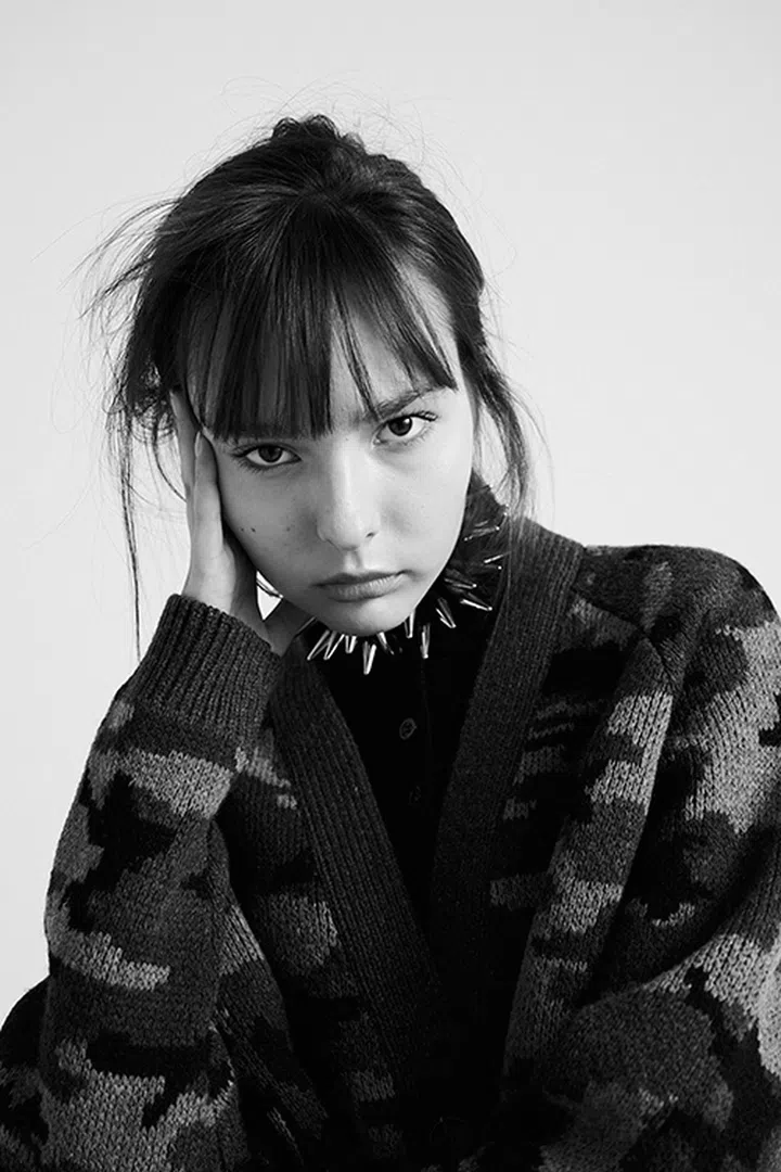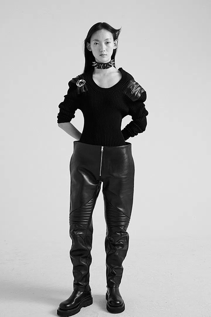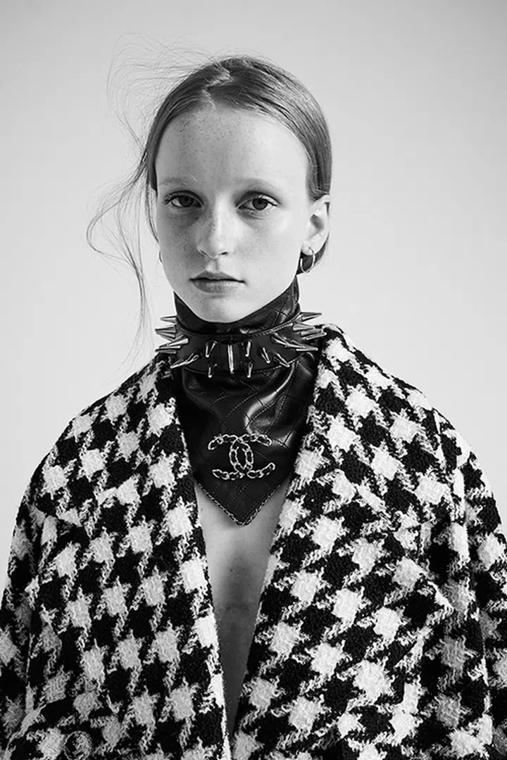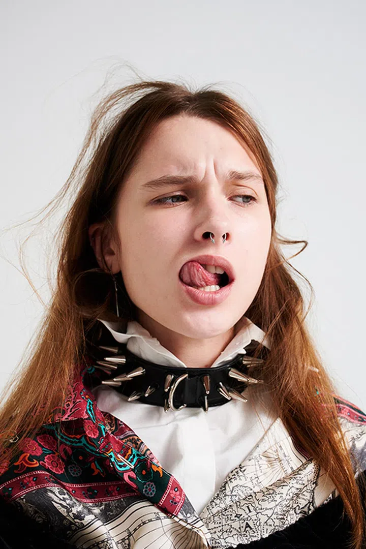 Wool sweater, Bottega Veneta. Silk shirt, Max Mara. Cotton shirt, Fendi. Patent leather choker with metal spikes (worn throughout), Gucci. All jewellery worn throughout unless stated, model’s own