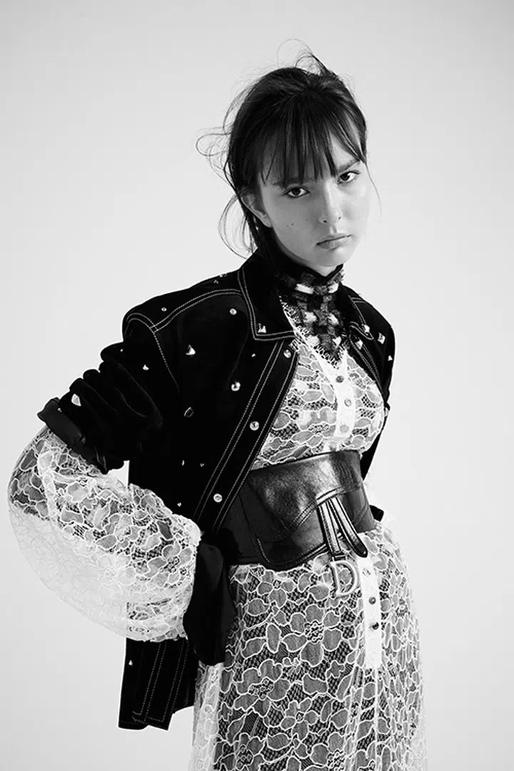 Suede shirt with metal studs, Hermes. Silk and lace dress, Loewe. Wool sweater and leather belt, Dior. Denim jeans, Bottega Veneta