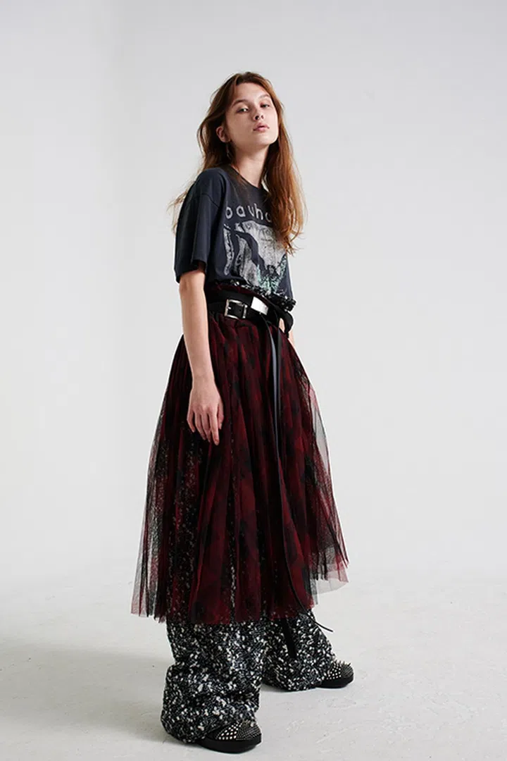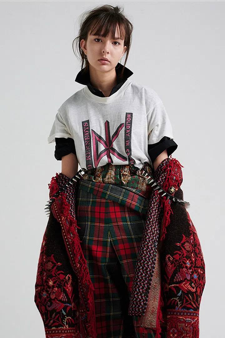 Polyester midi skirt, Dior. Wool tweed pants, Chanel. Leather boots with metal spikes, Gucci. Leather belts, Prada. T-shirt, stylist’s own