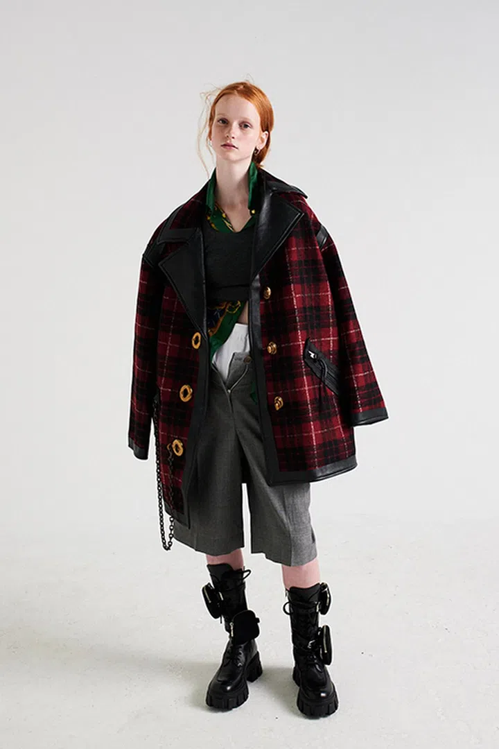 Wool and leather coat, Coach. Wool tank top, Miu Miu. Silk shirt, Gucci. Wool bermudas, Loewe. Cotton boxers, Etro. Leather boots, Prada