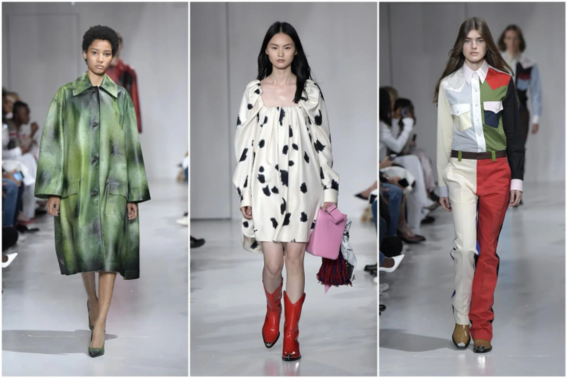 The Raf effect: Many elements seen in 205W39NYC are now unmistakable here – from the cowboy boots to the colour-blocked shirts and marching pants. The difference? These are more everyday-friendly in style, fabric and price. This season’s vaguely ’60s denim minidress, paired with patent leather boots, hints at Simons’ obsession with youth culture. The ’90s “cK Calvin Klein Jeans” logo shows up on patches that serve up a dose of nostalgia as much as utilitarianism, and cheeky dig at street culture – three things Raf is known for.