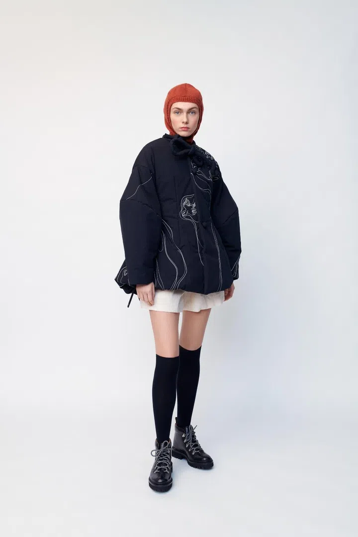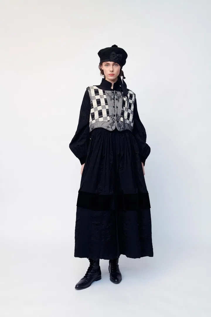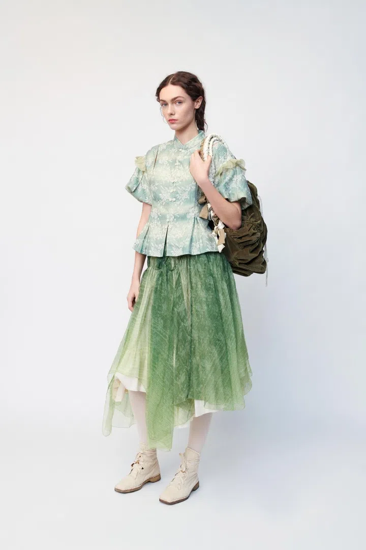 It’s also the kind of clothing that rewards those who take the time to appreciate its diffident strokes: detachable lace linings, fabric-covered buttons, hand-painted prints and custom fabrics such as cotton jacquard. Her trademark roomy pieces achieve their silhouette through an ancient Chinese form of pattern cutting – fabrics are cut directly on a table instead of against a mannequin.