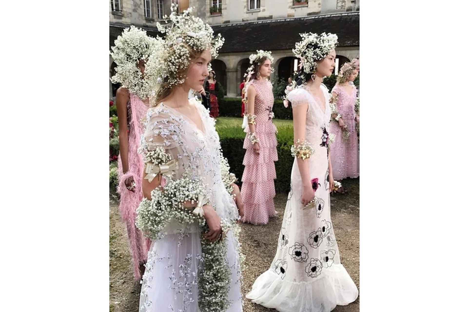At first glance, the flowers looked to be lily of the valley (the extremely expensive but lovely seasonal flowers used in Kate Middleton's wedding bouquet), but it's actually baby's breath. Yes, the humble posy often shunted as a filler was elevated to new heights by the Mulleavy sisters' team, led by hairstylist Odile Gilbert and florist Joseph Free.