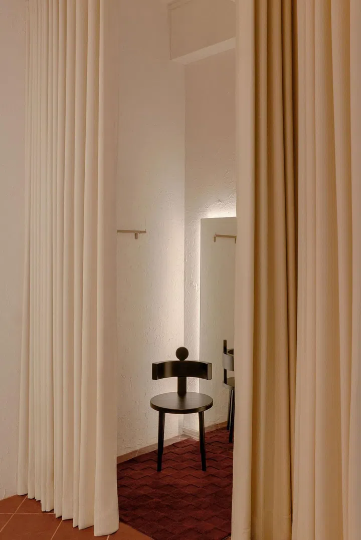 “That’s the first thing I think about when designing our space. The rug is actually a very special piece from Tanchen Studio. We previously collaborated with them on a bottle carrier. I wanted a textile for the floor that’s a variation of the grid tile flooring. I want your eyes to move from the small grid on the rug to more geometric patterns in the shop when you step out of the changing room. It’s very comfortable to be in here. I wanted a big enough space that even a pram can go in. I wanted it to be luxurious in the sense that I give my customers space, so they can sit down to slowly think and appreciate the pieces they’ve tried. The high ceiling also gives off a grand feeling. We love a curtained fitting room that’s not boxed up.”