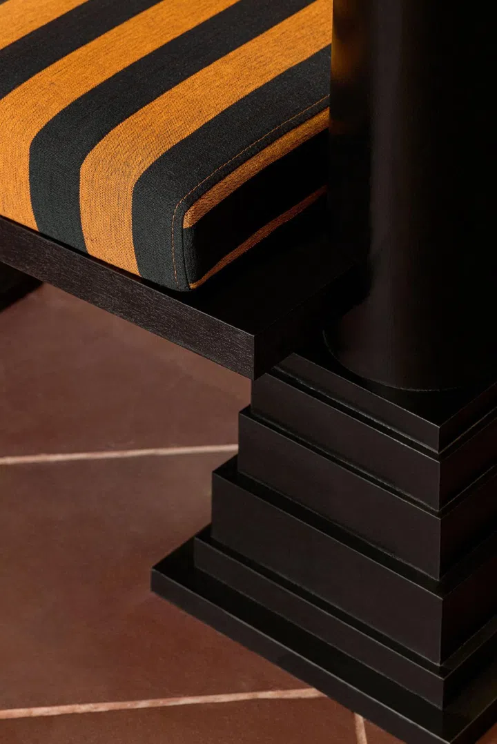 The ebony columns and striped upholstery in the store have a strong connection to the Sri Lankan residence of architect Geoffrey Bawa.