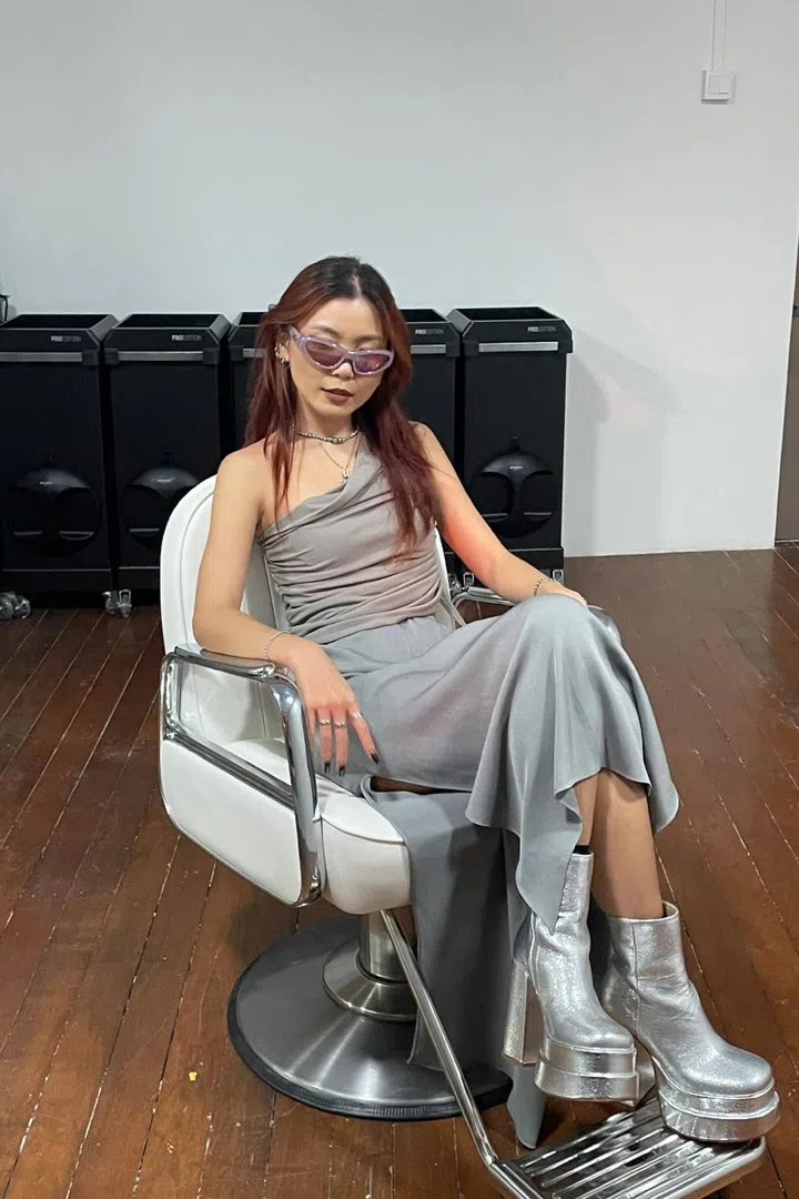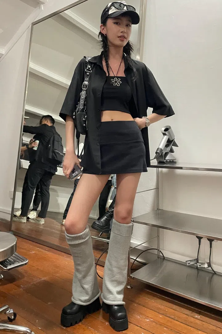 What she is wearing: Gentle Monster sunglasses; thrifted tube top and shirt; Ghostboy skirt; Balenciaga bag; leg warmers from Shopee; and Lamoda boots