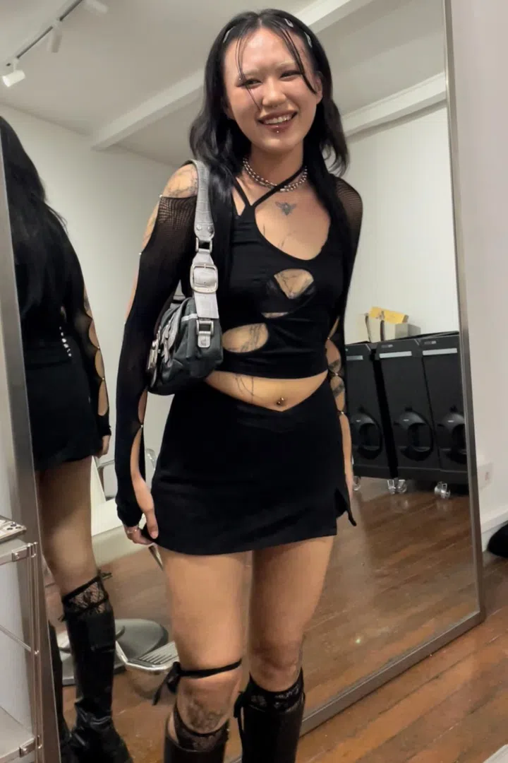 What she is wearing: Thrifted top; Daniel Yam skirt; Gentle Monster sunglasses; Steve Madden boots; thrifted Prada bag; and Visualjargon necklace