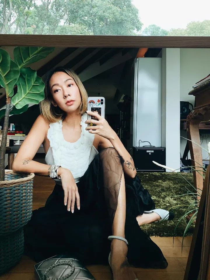 Founder of creative agency Elementary Co./Female Collective member Charmaine Seah-Ong wears muslin halter top, organza skirt, metal cuff with calfskin, glass, resin and strass, lambskin sandals, and metallised lambskin wristlet clutch, Chanel