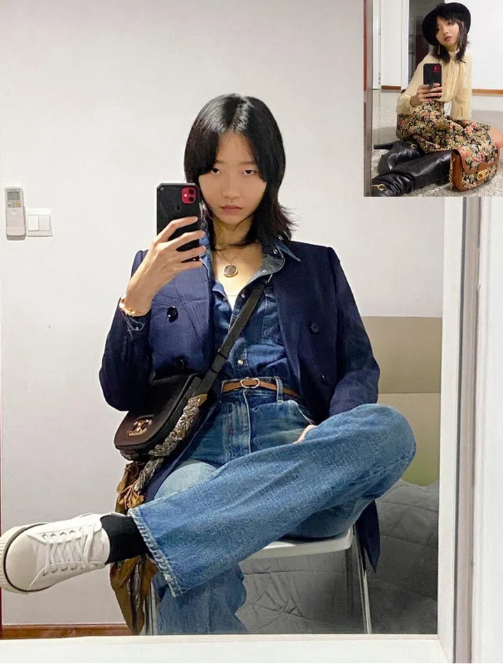 (From top) Model Kaigin Yong wears Celine By Hedi Slimane silk blouse, jacquard skirt, matching Maillon Triomphe shoulder bag with calfskin, brass earrings, matching necklace and Claude calfskin boots, and wool jacket, denim shirt, matching jeans, silk jersey tank top, brass necklace with python skin pendant, brass bracelet, Maillon Triomphe calfskin shoulder bag with silk scarf, and canvas and calfskin sneakers, Celine. All other accessories, her own