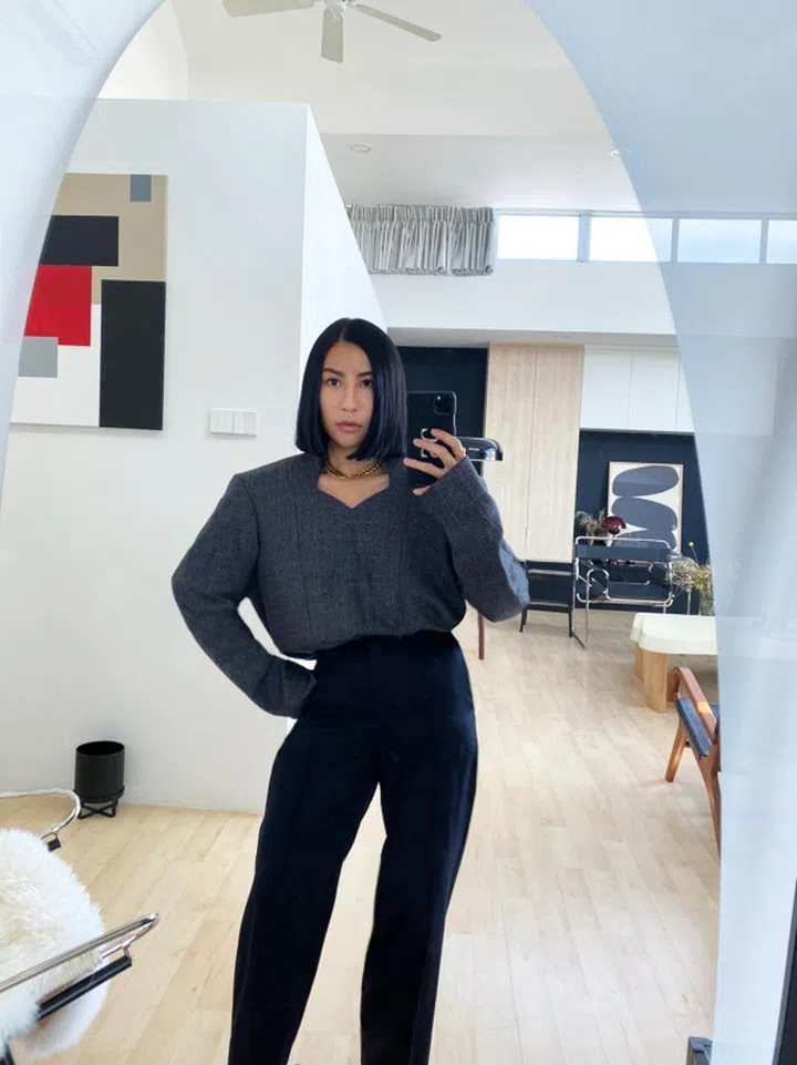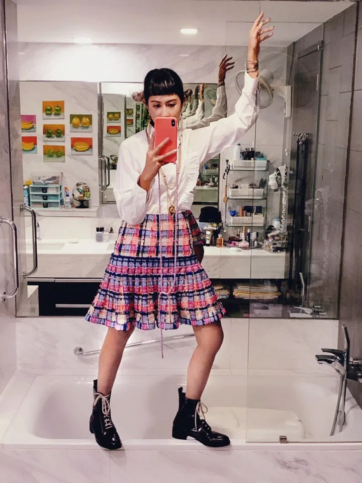 Business consultant/style star Savina Chai wears wool dress (worn as top), Balenciaga. All other clothes and accessories, her own