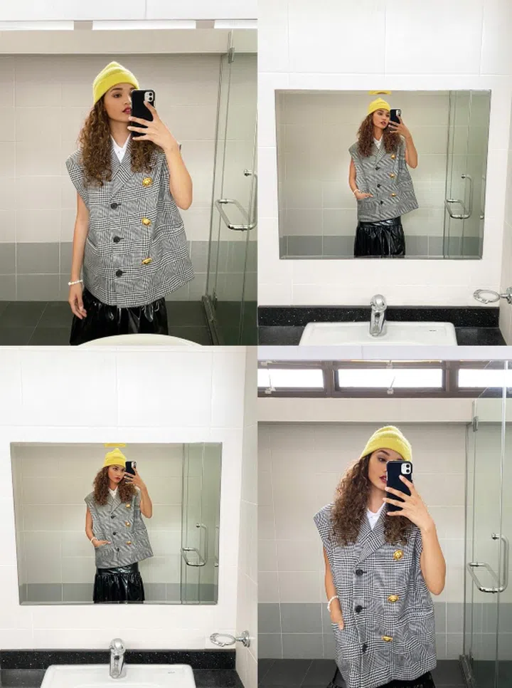 Singer/model/influencer Iman Fandi wears wool vest, cotton blouse, and polyester skirt, Miu Miu. Beanie and bracelet, her own