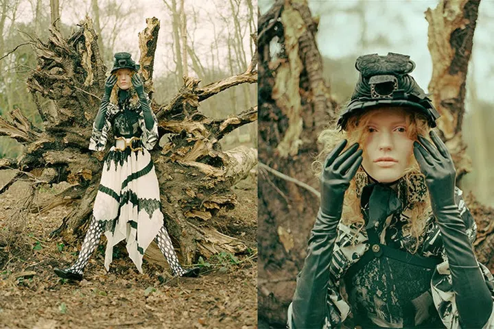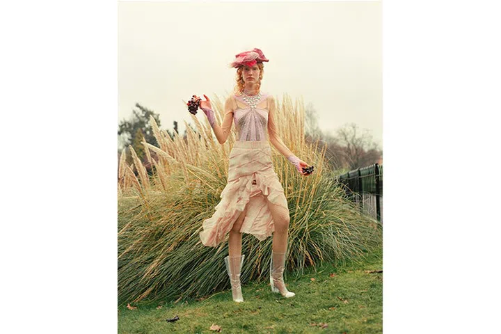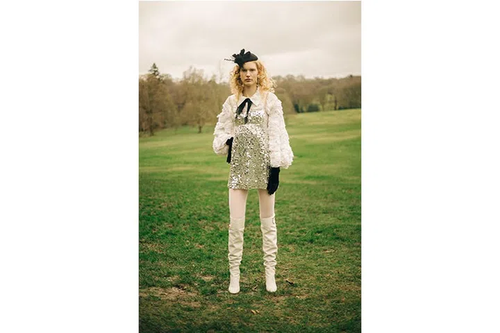 Tulle slip dress with acrylic mirrors, Dior. Chiffon-blend shirt and acrylic drop earrings, Chanel. Cotton leggings, Wolford. Velvet gloves, Marc Jacobs. Calf leather boots, Salvatore Ferragamo.