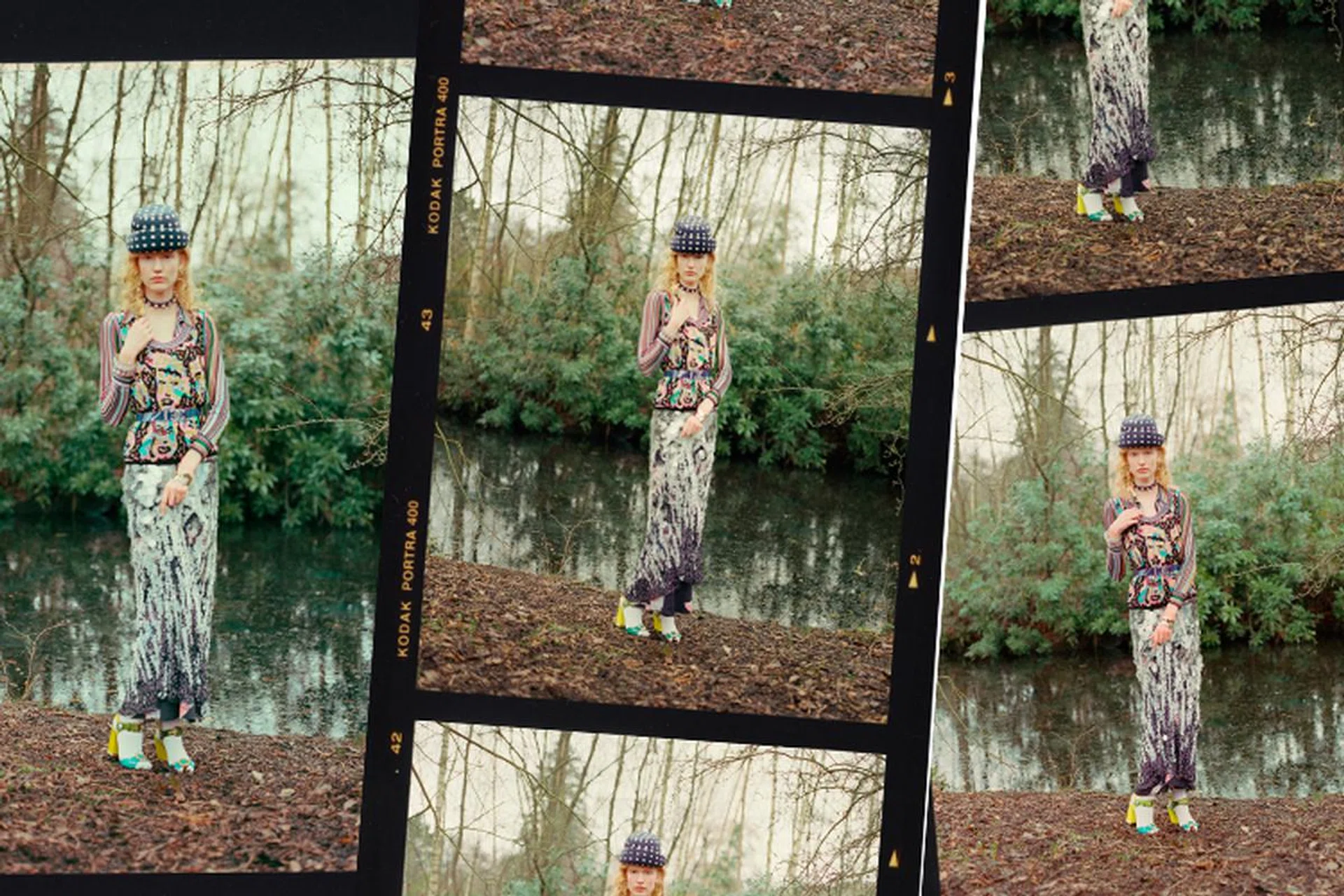 Wool-blend vest, matching shirt, acrylic drop earrings and matching bracelets (on left hand), Missoni. Polyester-blend skirt with paillettes, Salvatore Ferragamo. Cotton leggings, Wolford. Leather choker, Kenzo. Acrylic bracelet (on right hand), and patent leather belt with crystals, Chanel. Acrylic sandals, Dolce & Gabbana.