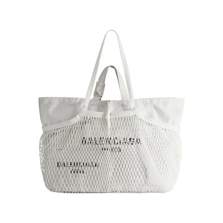 This Balenciaga tote bag features a distressed effect on nylon and fishnet. It includes two separate compartments, creating additional space within the bag. The design also features double handles for both hand and shoulder carry.