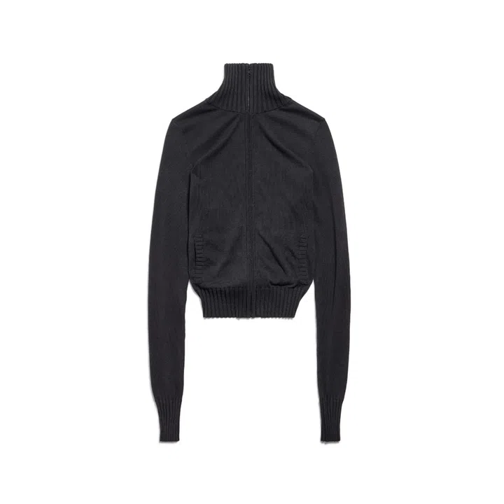 This piece is a high-neck turtleneck zip-up jacket. Its distinctive feature is a knot detail at the back, which creates a fitted look, complemented by the BB Paris icon logo embroidered at the rear.