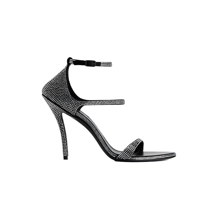 The most distinctive feature of this pair of heels is its rhinestone-covered design. The heel boasts a tone-on-tone finish and is complemented by an adjustable ankle strap. These high heels are eye-catching and make for the perfect statement piece.