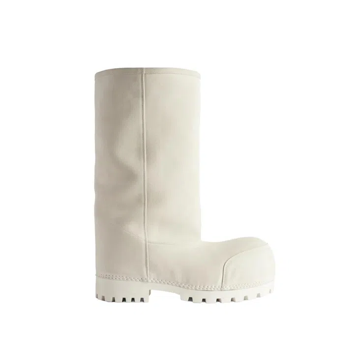 This high boot features exaggerated proportions, with an extra round toe and a thick rubber sole. The Balenciaga logo and details are also stamped on the back of the boot.