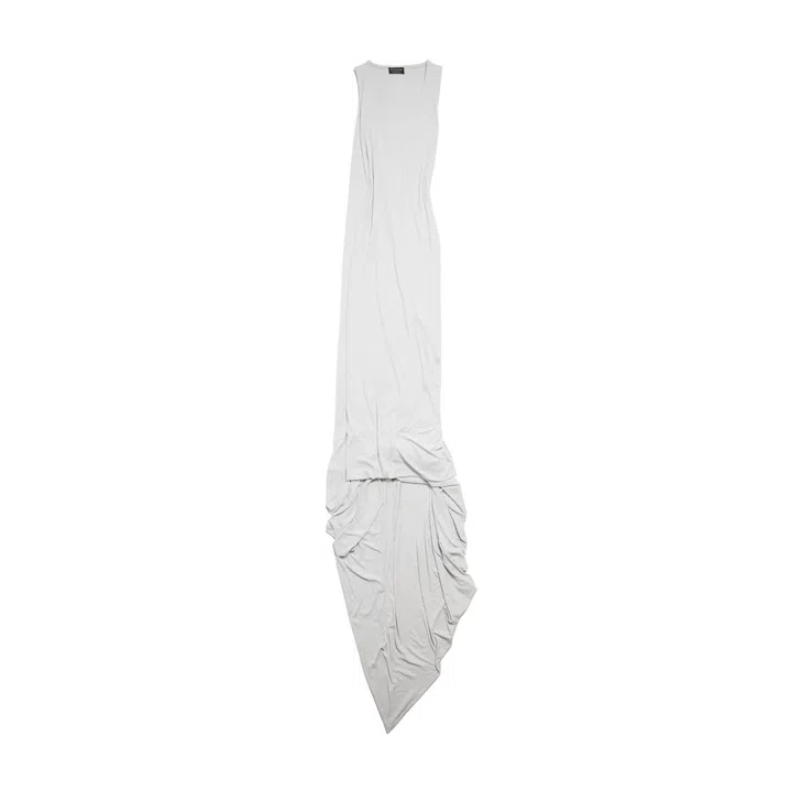 Made from lightweight ribbed jersey, this scoop neck sleeveless gown features an asymmetric drape and a weighted train at the back.