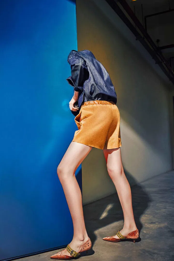 Velvet and calfskin shorts, $1,010, and denim jacket, $1,010, Longchamp.Velvet Mary Janes, $1,400, Bottega Veneta. Prices unavailable unless stated