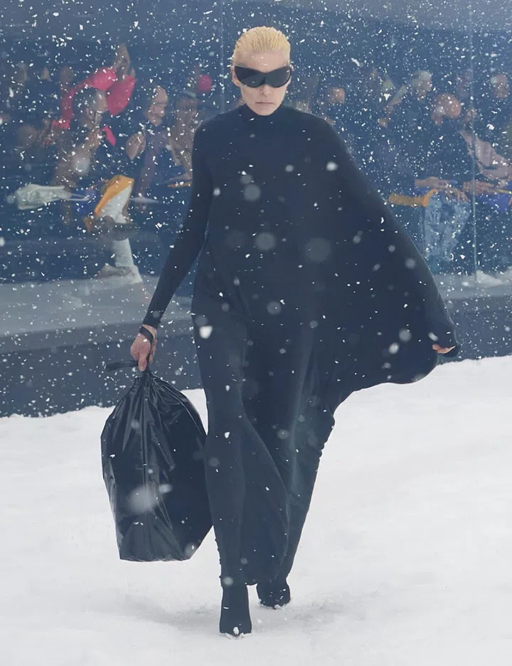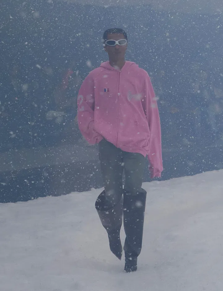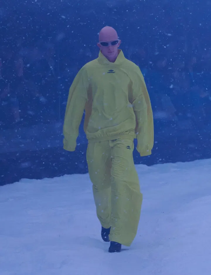 The show was allegorical. Guests were ushered to a pitch-black venue that lit up to unveil a glass amphitheatre housing an Artic tundra. Models who were dressed in Balenciaga’s trademark silhouettes of baggy jeans, hybrid stretch dresses, bodysuits and oversized and shrunken tops made an arduous 360° trek on the snowy trail, pelted by blustery winds and snow – some visibly shaking in the cold. (The initial concept for the set was meant to allude to the climate crisis but it took on a totally loaded meaning in light of current events.)