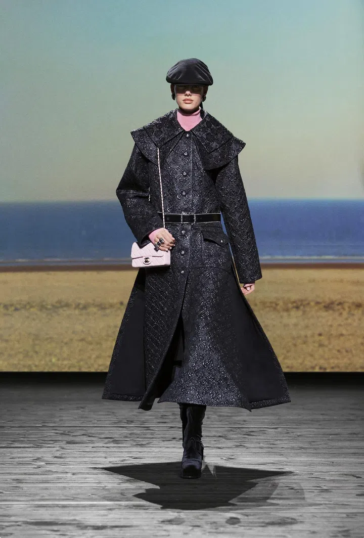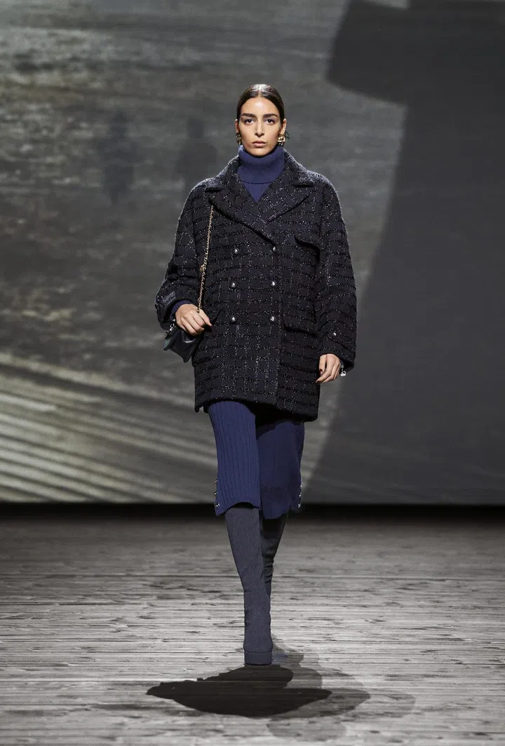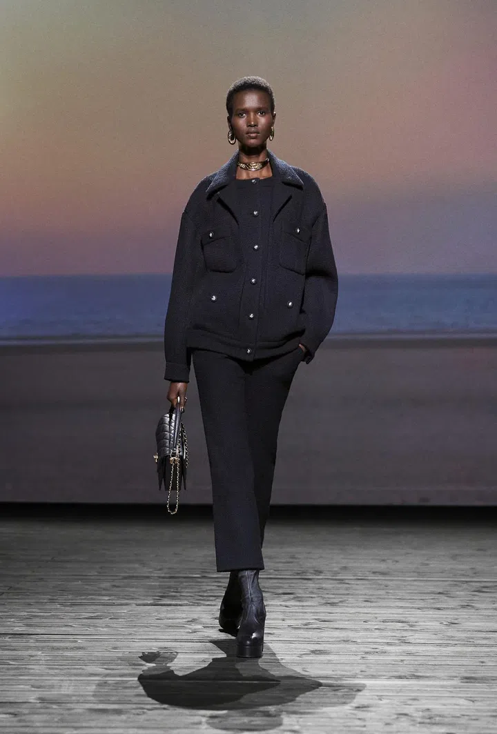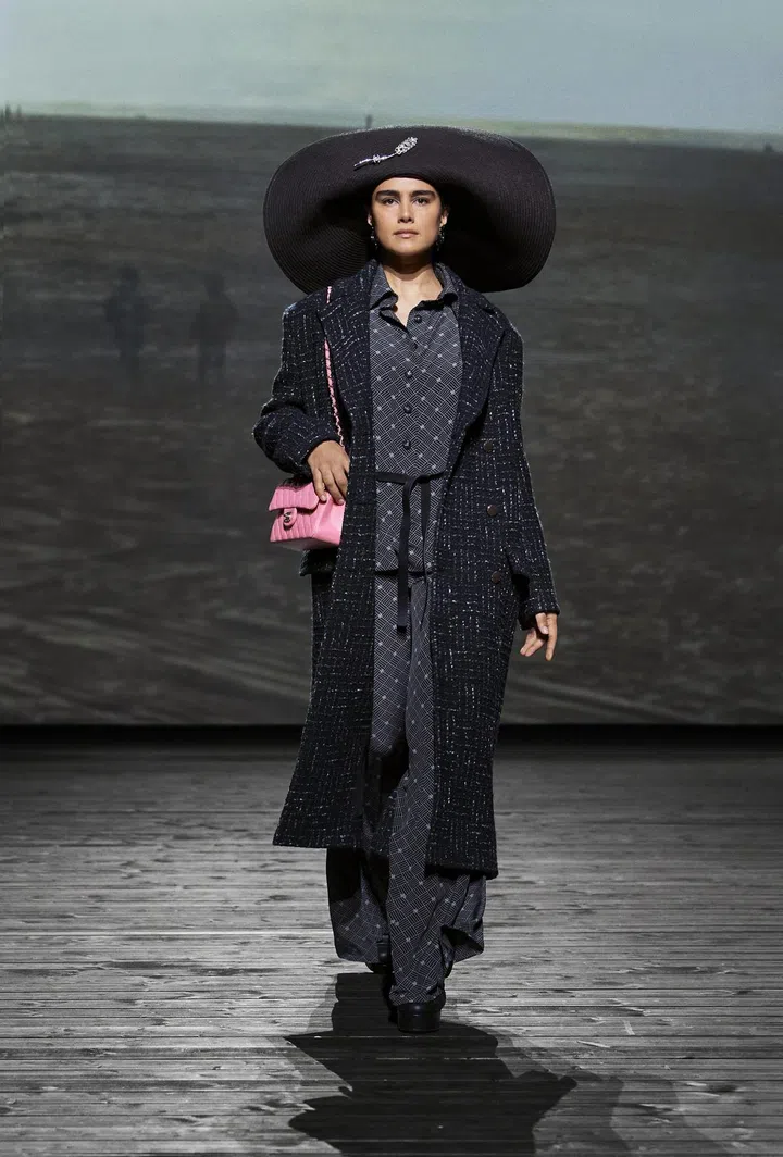 Throughout the 73-look collection, models effortlessly paired this versatile bag with a plethora of looks, showcasing the heavy menswear influences that Mademoiselle Chanel mined throughout her career, which have since become house codes. This is evident in the broad-shouldered peacoats, bathrobe-belted coats, tweed suits, culottes, and drop-front trousers. These elements are cleverly contrasted with flirty low-cut tops featuring flounce and negligees, evoking the daintiness of waves breaking and a soft wind blowing. Desirable? Check. Romantic? Check. Modern? Double check.