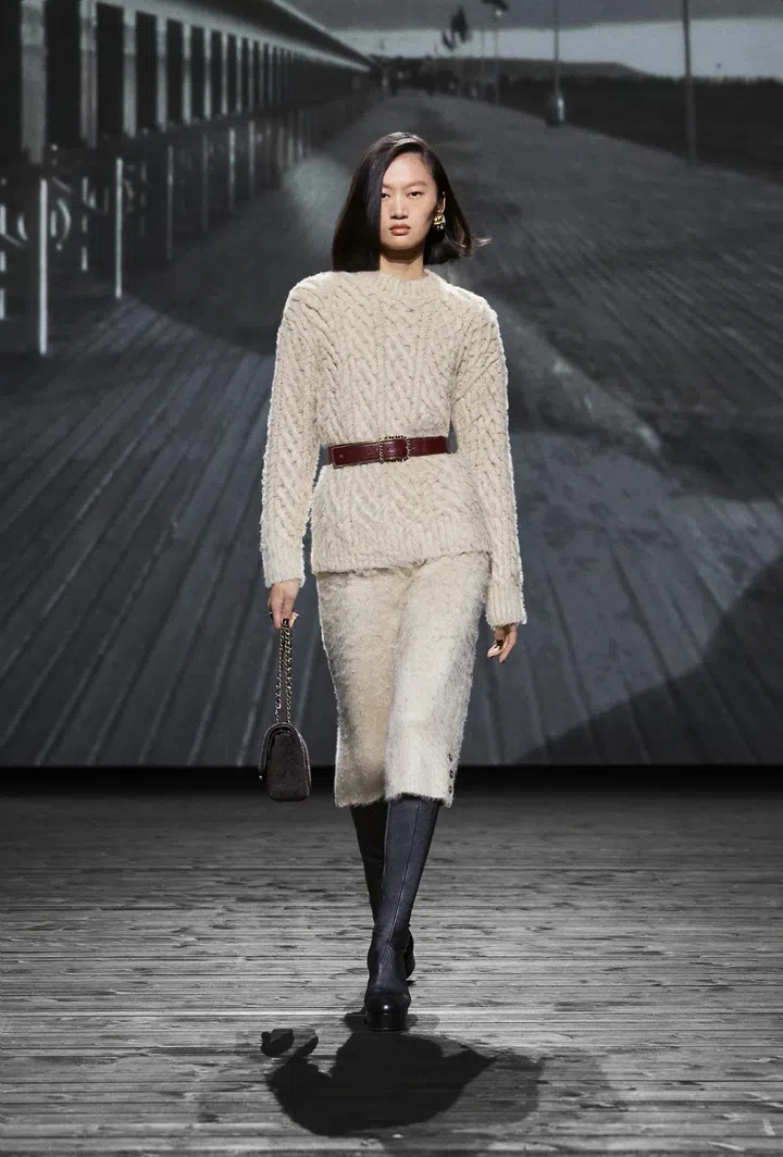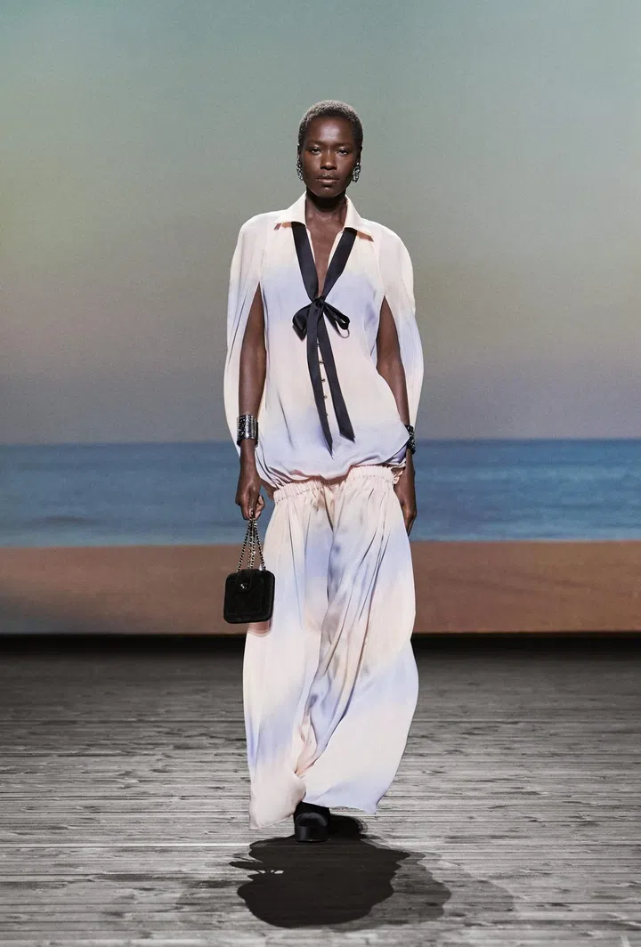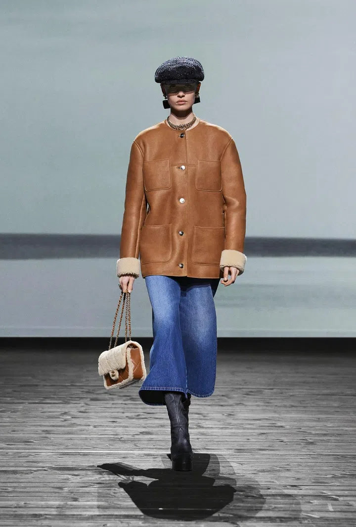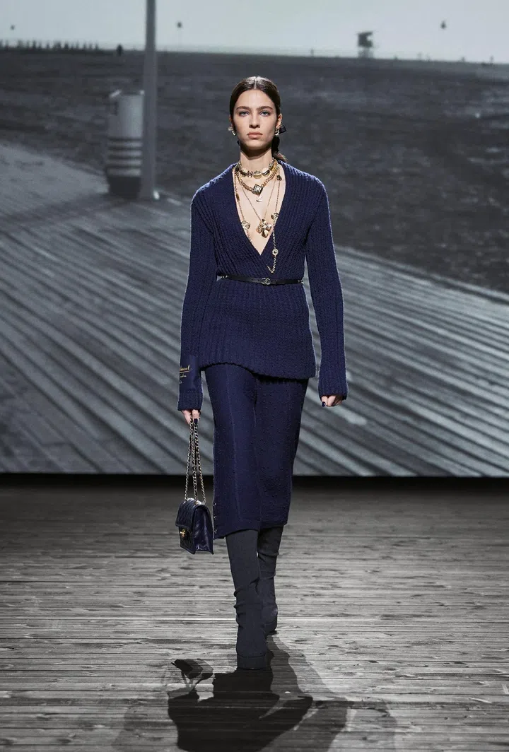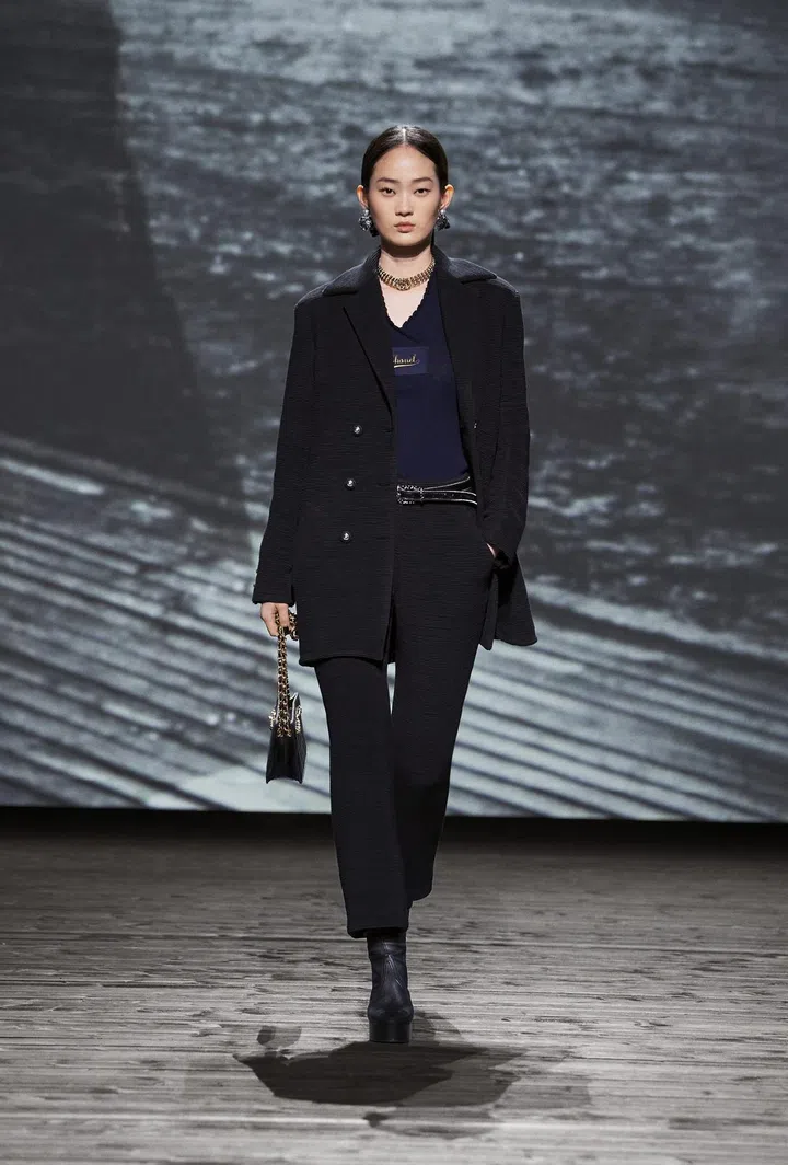Throughout the 73-look collection, models effortlessly paired this versatile bag with a plethora of looks, showcasing the heavy menswear influences that Mademoiselle Chanel mined throughout her career, which have since become house codes. This is evident in the broad-shouldered peacoats, bathrobe-belted coats, tweed suits, culottes, and drop-front trousers. These elements are cleverly contrasted with flirty low-cut tops featuring flounce and negligees, evoking the daintiness of waves breaking and a soft wind blowing. Desirable? Check. Romantic? Check. Modern? Double check.