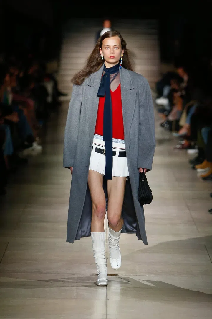 Back in the 2000s, the skinny scarf was rocked by everyone from Kate Moss to Hilary Duff. It seemed like Miu Miu was kickstarting the revival of this noughties trend at the show with its own spin in colours like white, navy blue and black.
